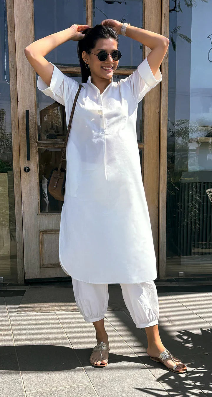 Top Style: Long kurta with high-low hem, 3/4th sleeves, buttoned front, and side pockets